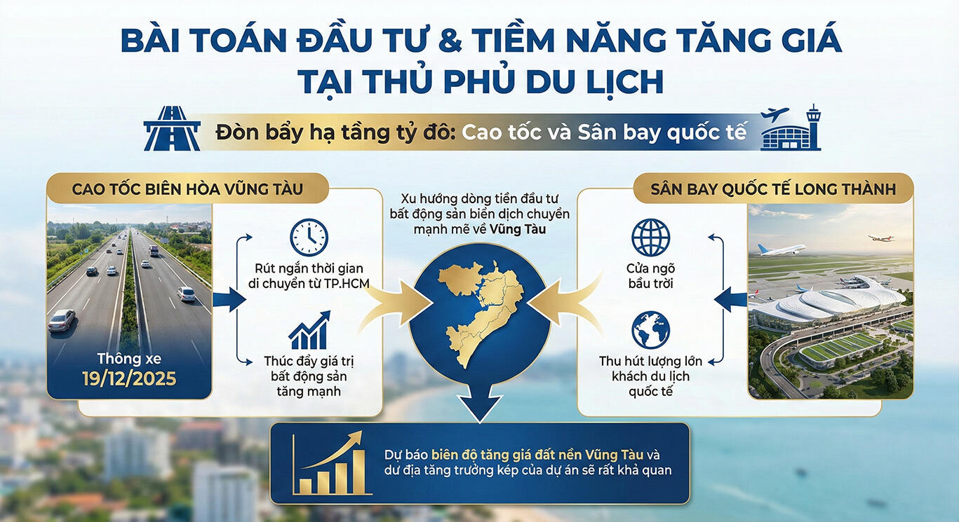 Tác động trực tiếp của tuyến cao tốc Biên Hòa Vũng Tàu thông xe 19/12/2025 sẽ rút ngắn đáng kể thời gian di chuyển từ TP.HCM, thúc đẩy giá trị bất động sản tăng mạnh. Bên cạnh đó, vai trò cửa ngõ bầu trời của sân bay quốc tế Long Thành sẽ thu hút lượng lớn khách du lịch quốc tế đổ về đây.