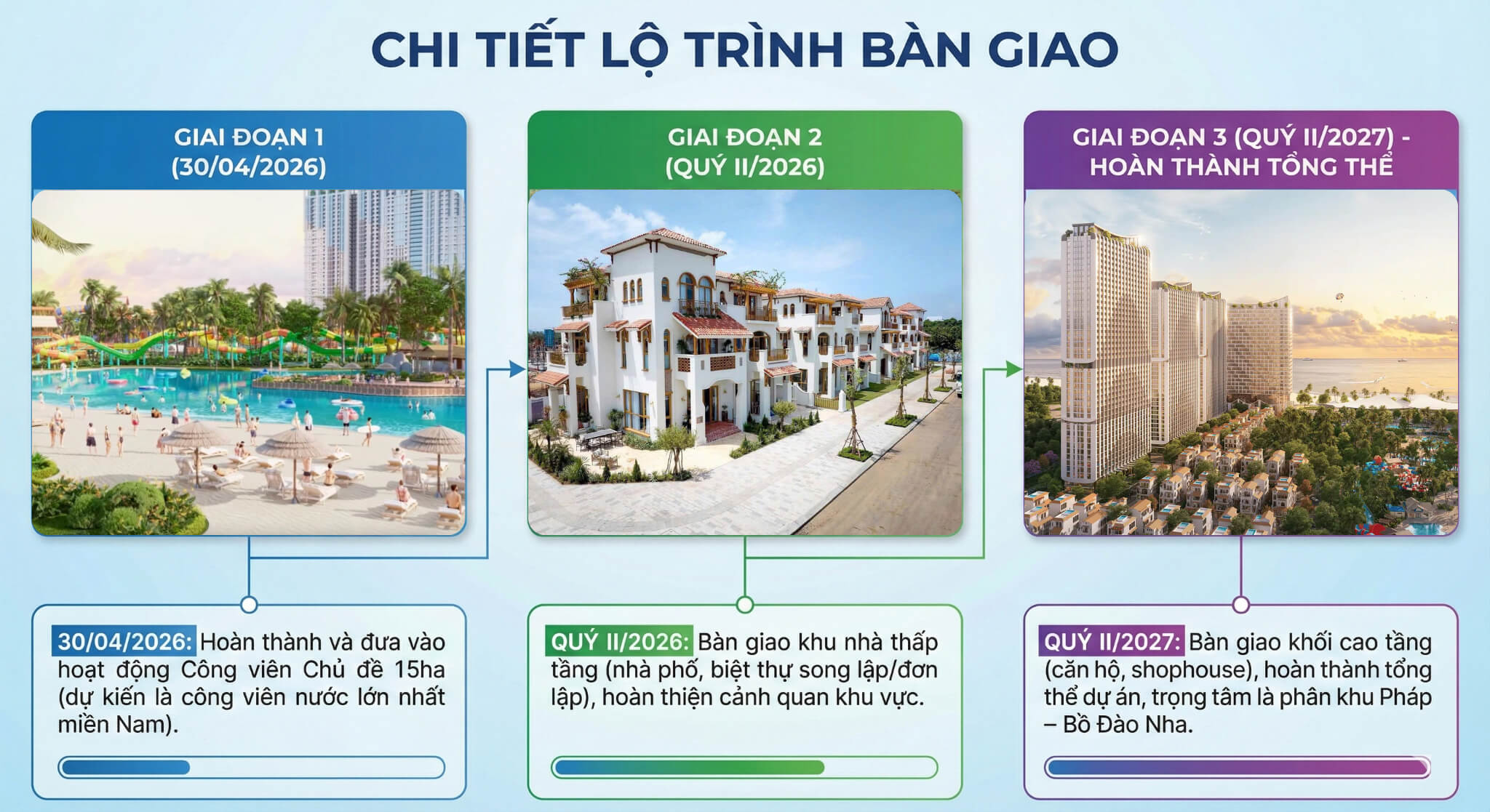 Theo kế hoạch, mốc thời gian khởi công dự kiến vào Quý 2 năm 2025 sẽ chính thức đánh dấu sự hiện diện của siêu dự án này trên bản đồ bất động sản. Lộ trình bàn giao nhà hoàn thiện cho khách hàng được ấn định vào Quý 4 năm 2026, thể hiện cam kết mạnh mẽ của chủ đầu tư.