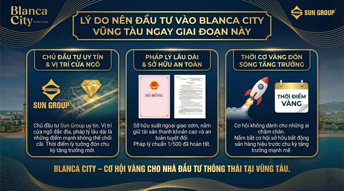 Chủ đầu tư Sun Group uy tín cùng vị trí cửa ngõ đắc địa và pháp lý lâu dài là những điểm mạnh không thể chối cãi. Đây là thời điểm lý tưởng để sở hữu tài sản trước chu kỳ tăng trưởng mới của bất động sản Vũng Tàu.