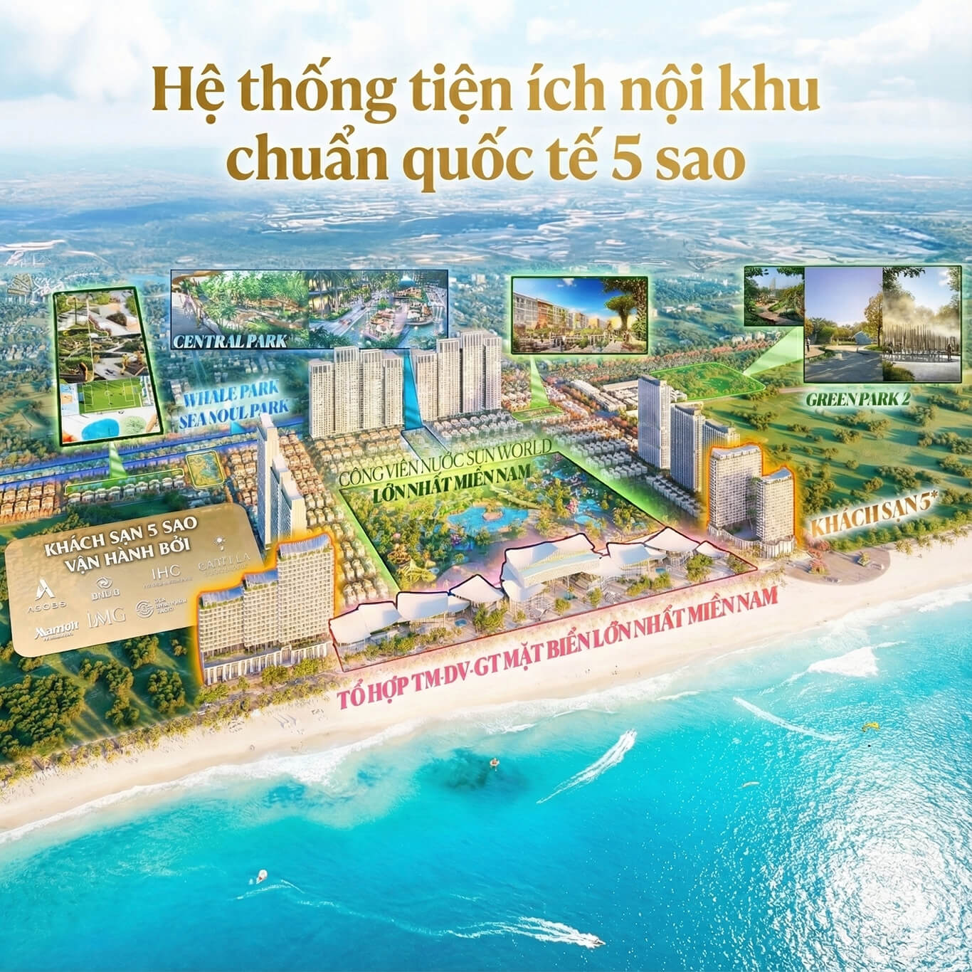 Hệ thống tiện ích đỉnh cao bao gồm Trung tâm thương mại Sun Retail rộng 5ha và khu khách sạn cao tầng sang trọng. Bên cạnh đó là bến du thuyền và quảng trường biển sầm uất phục vụ nhu cầu giải trí.