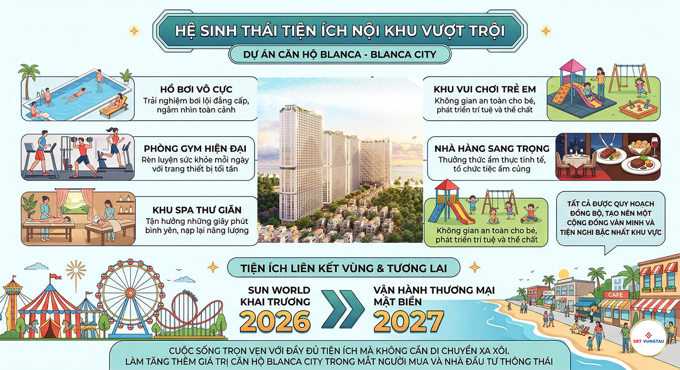 Từ năm 2027 dự án Blanca City bước vào giai đoạn vận hành thực tế với việc bàn giao căn hộ và thương mại mặt biển đồng bộ nha. Cùng lúc đó cảng Cái Mép Thị Vải mở rộng tăng cường vai trò của Vũng Tàu như một trung tâm logistics quan trọng của cả nước đâu. Những yếu tố này củng cố mạnh mẽ vị thế của thành phố biển trong mắt các nhà đầu tư quốc tế nhé.