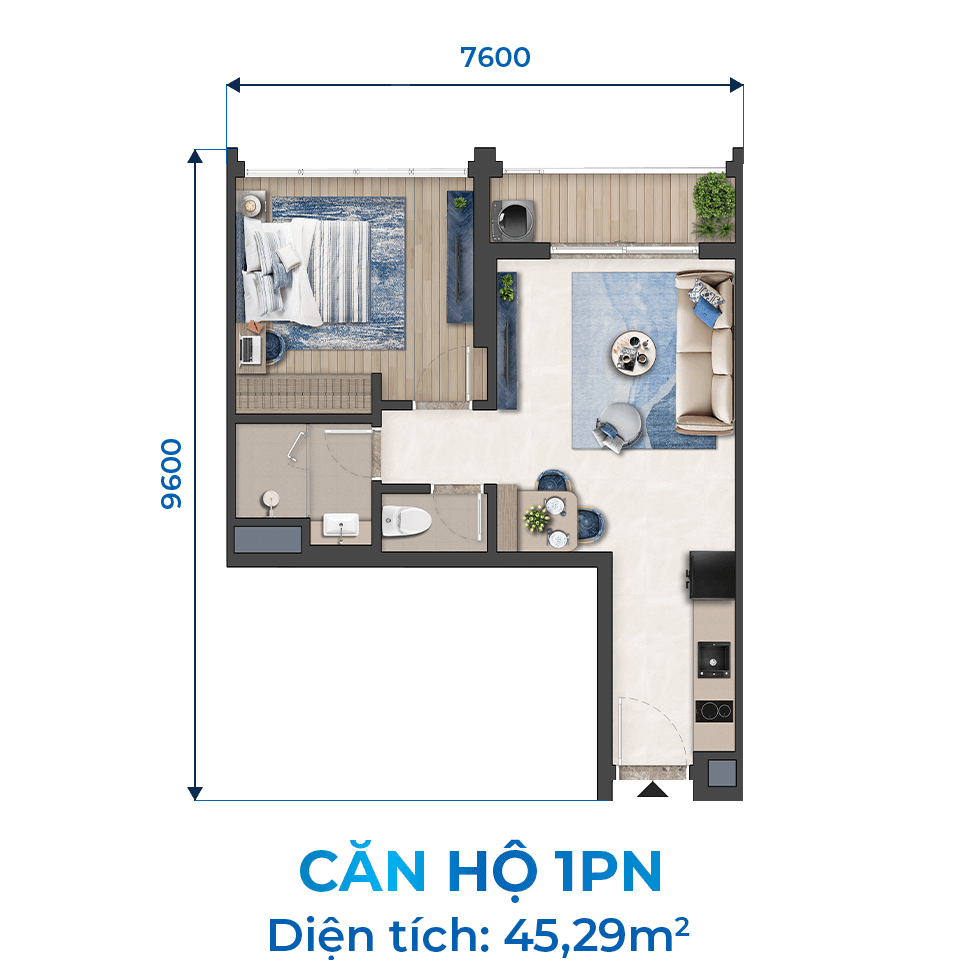 🔹 1 Phòng Ngủ: 45 – 47,4 m²