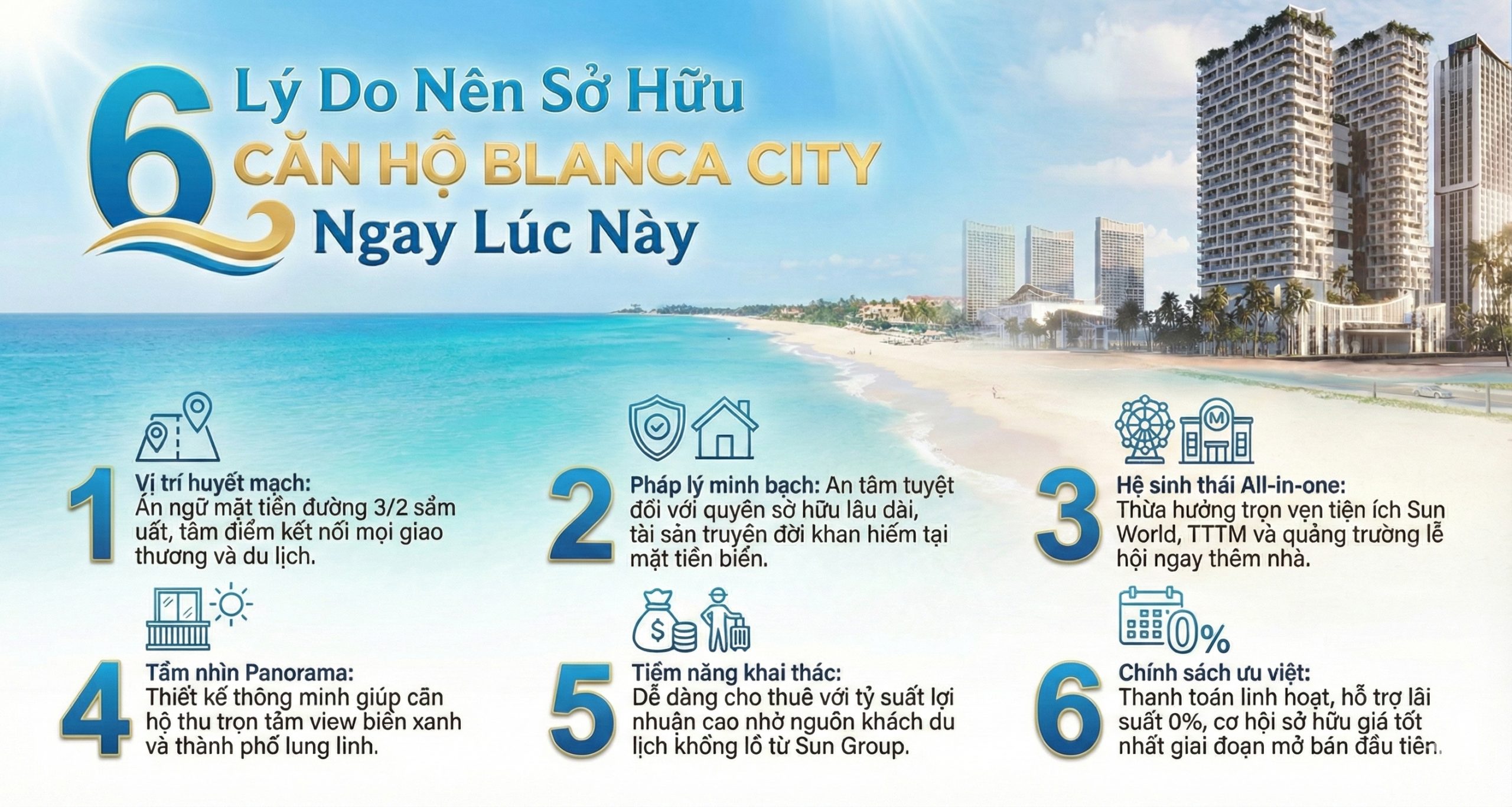 Tọa lạc đắc địa trên trục đường huyết mạch 3/2, Căn hộ Blanca là dòng sản phẩm cao tầng chủ lực thuộc siêu dự án Blanca City quy mô 96ha. Với cảm hứng từ những “du thuyền trên cạn”, dự án thiết lập chuẩn sống thượng lưu: 100% căn hộ sở hữu tầm nhìn trực diện biển, bàn giao full nội thất 5 sao tinh tế.