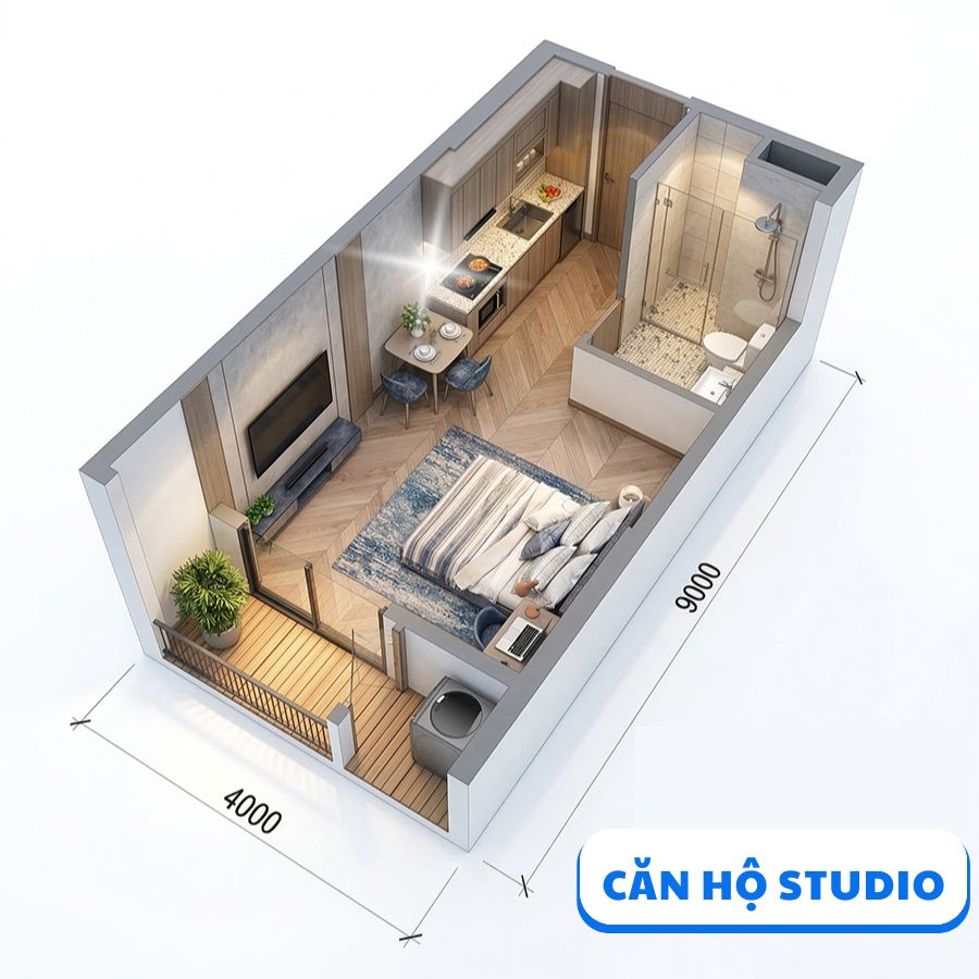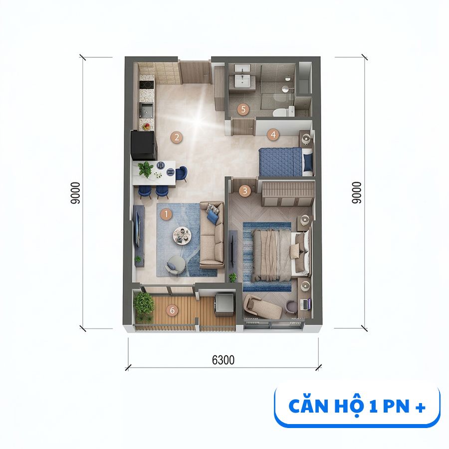 🔹 1 Phòng Ngủ + : 50,1m2 – 59,4 m²