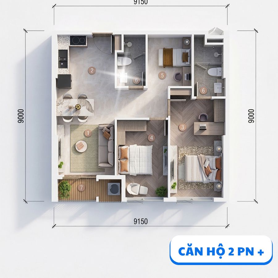 🔹 2 Phòng Ngủ + : 65,7m2 – 79,9 m²