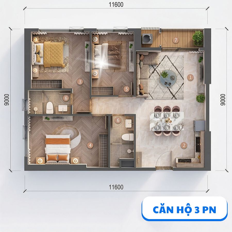🔹 3 Phòng Ngủ: 94,3m² – 109,7m²