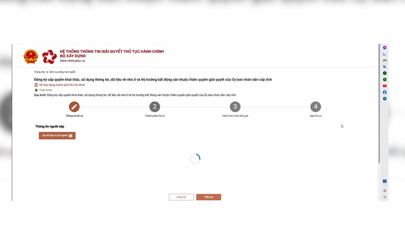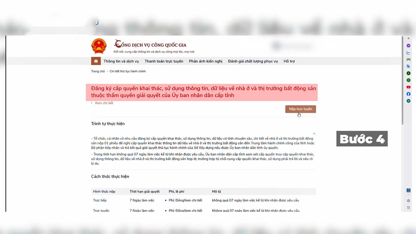 Tìm thủ tục “Đăng ký cấp quyền khai thác, sử dụng thông tin, dữ liệu về nhà ở và thị trường bất động sản thuộc thẩm quyền giải quyết của Ủy ban nhân dân cấp tỉnh, Bộ Xây dựng” và chọn nộp trực tuyến.
