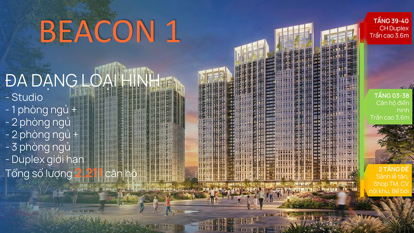Tóm tắt ý chính (BLUF): Tòa Beacon chia làm 2 khu (Beacon 1 và 2) với các tháp E1 (39 tầng), E2 (40 tầng), E3 (39 tầng) và E5 (35 tầng). Đây là quỹ đất ở sở hữu lâu dài cực hiếm, biểu tượng của sự sang trọng và riêng tư.