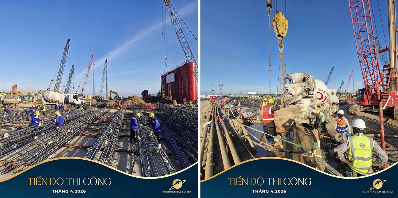 Bước sang tháng 4/2026, tiến độ Sunshine Bay Retreat chính thức đẩy mạnh thi công cọc đại trà D1000 và hoàn thiện hạ tầng móng. Toàn bộ nguồn lực đang được Sun Shine tập trung tối đa để đảm bảo lộ trình vươn mình thành Tổ hợp nghỉ dưỡng 5 sao thế hệ mới.