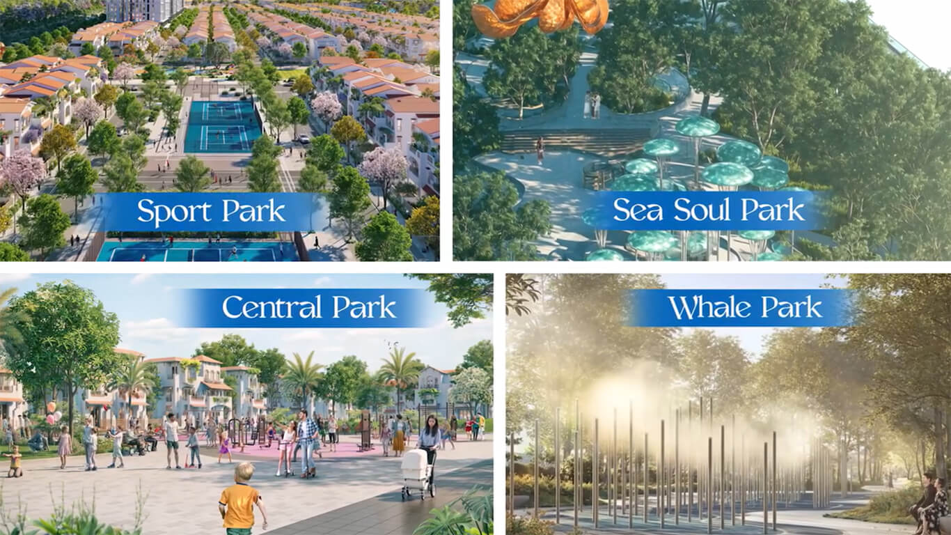 Tóm tắt: Hệ thống 5 công viên vệ tinh gồm Coastal Park, Whale Park, Sea Soul Park, Central Park và Sport Park tạo nên vành đai xanh kết nối biển và khu dân cư, phục vụ riêng biệt cho từng nhóm nhu cầu của cư dân.
